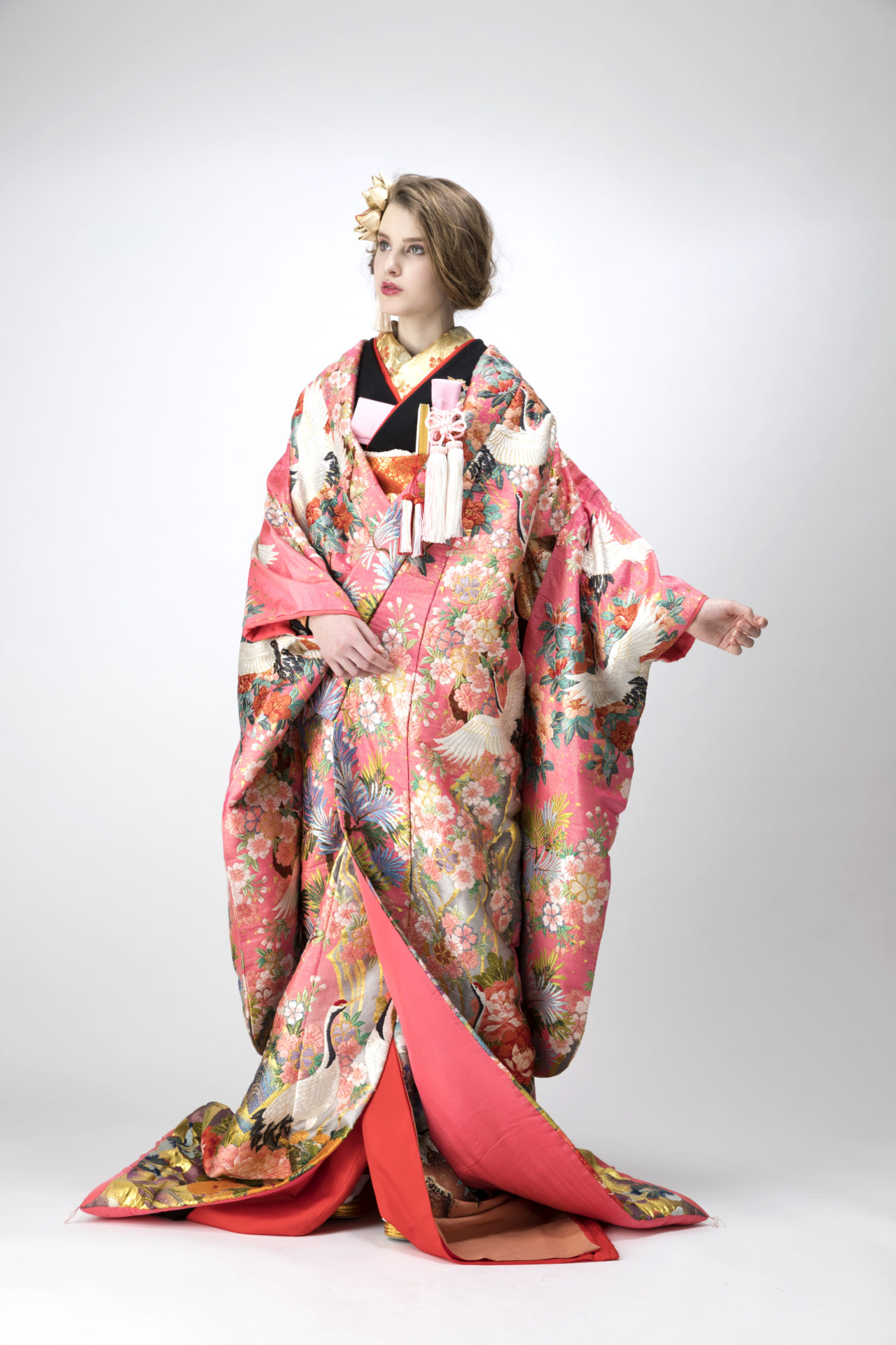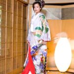 挙式は引き振袖に白無垢を羽織り、 ご祝宴のときは引き振袖に色打掛 もしくは引き振袖だけで華麗に自分らしいコー ディネートを。